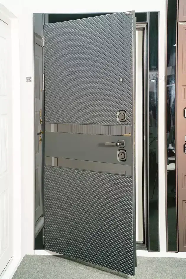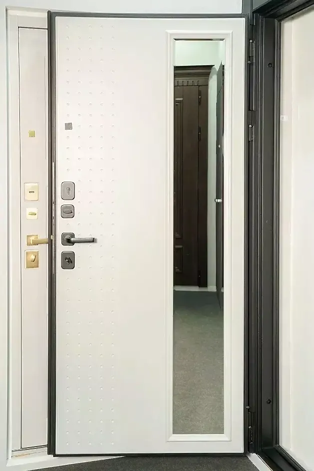 Дверь «Бера» - зеркальная внутренняя панель, экономия места. Полотно 100 мм, сталь 1,2 мм, вес ≈ 90 кг. Цена 64 790₸.